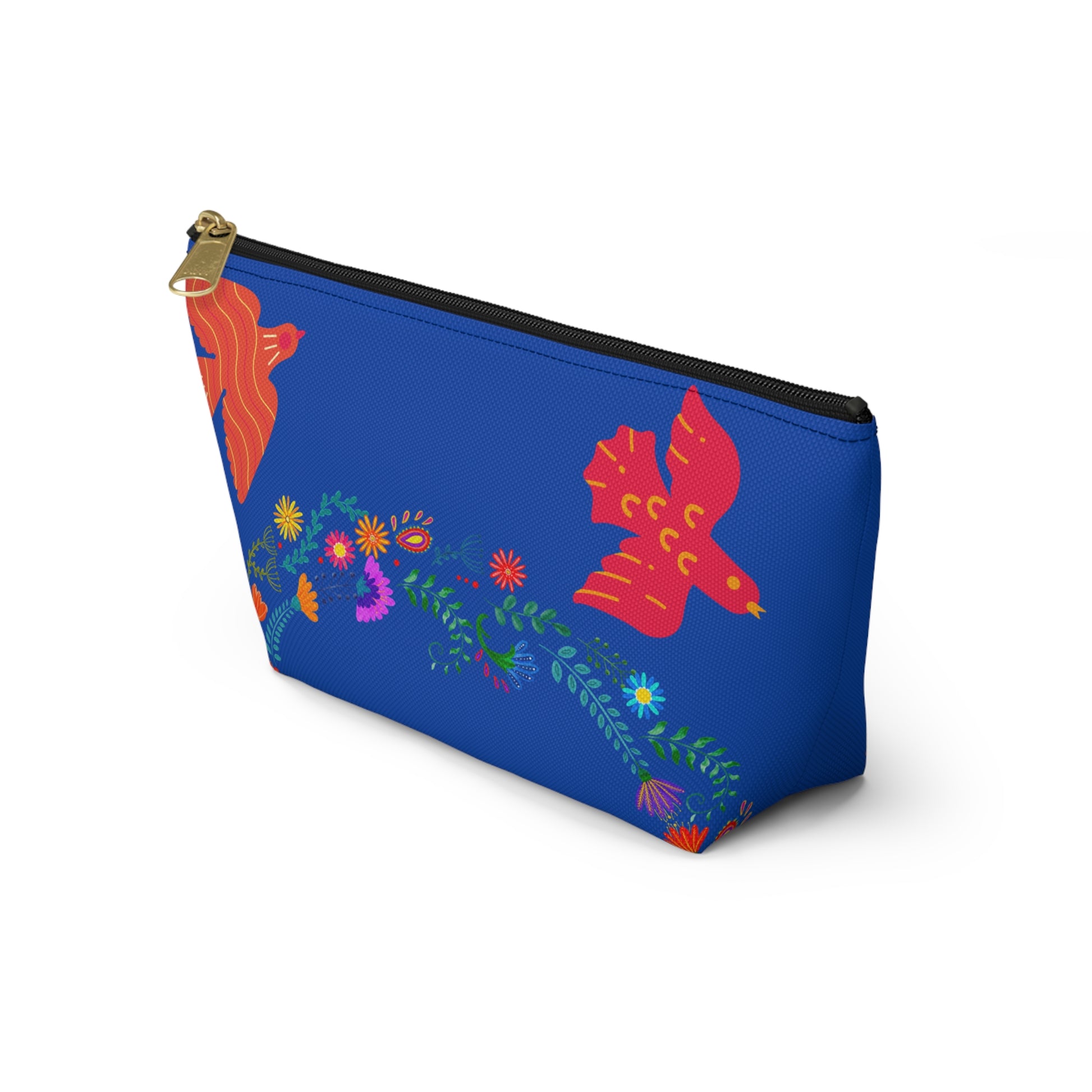 A bright, T-bottom accessory pouch that carries a joyful folk-art scene. Vivid birds and floral garlands float across a cobalt canvas, printed with crisp, saturated inks that keep colors lively over time. The structured T-bottom creates a stable base so the pouch stands open on a dresser or in a tote, while a gold-colored zipper pull adds a warm, tactile finishing touch.