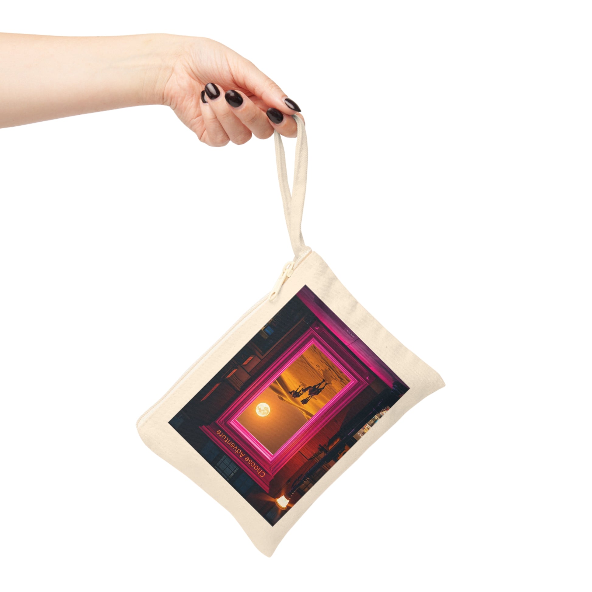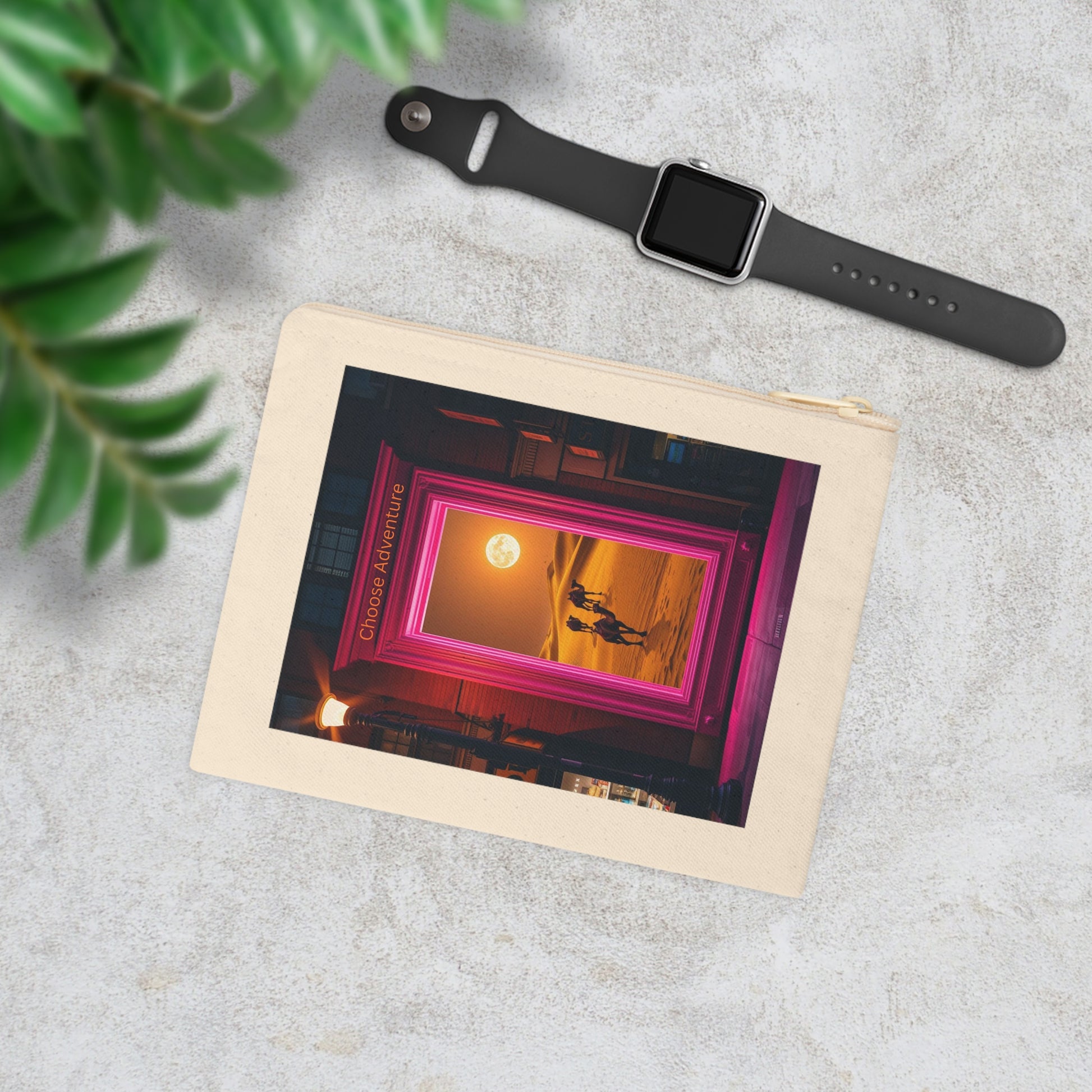 A compact cotton canvas pouch that carries a cinematic moment wherever you go. The natural cream canvas and matching zipper frame a bold, one-sided print: a glowing magenta doorway opening onto a desert under a full moon, with a lone traveler stepping toward the horizon. Lightweight and tactile, the pouch feels lived-in from the first touch and holds daily essentials without fuss.