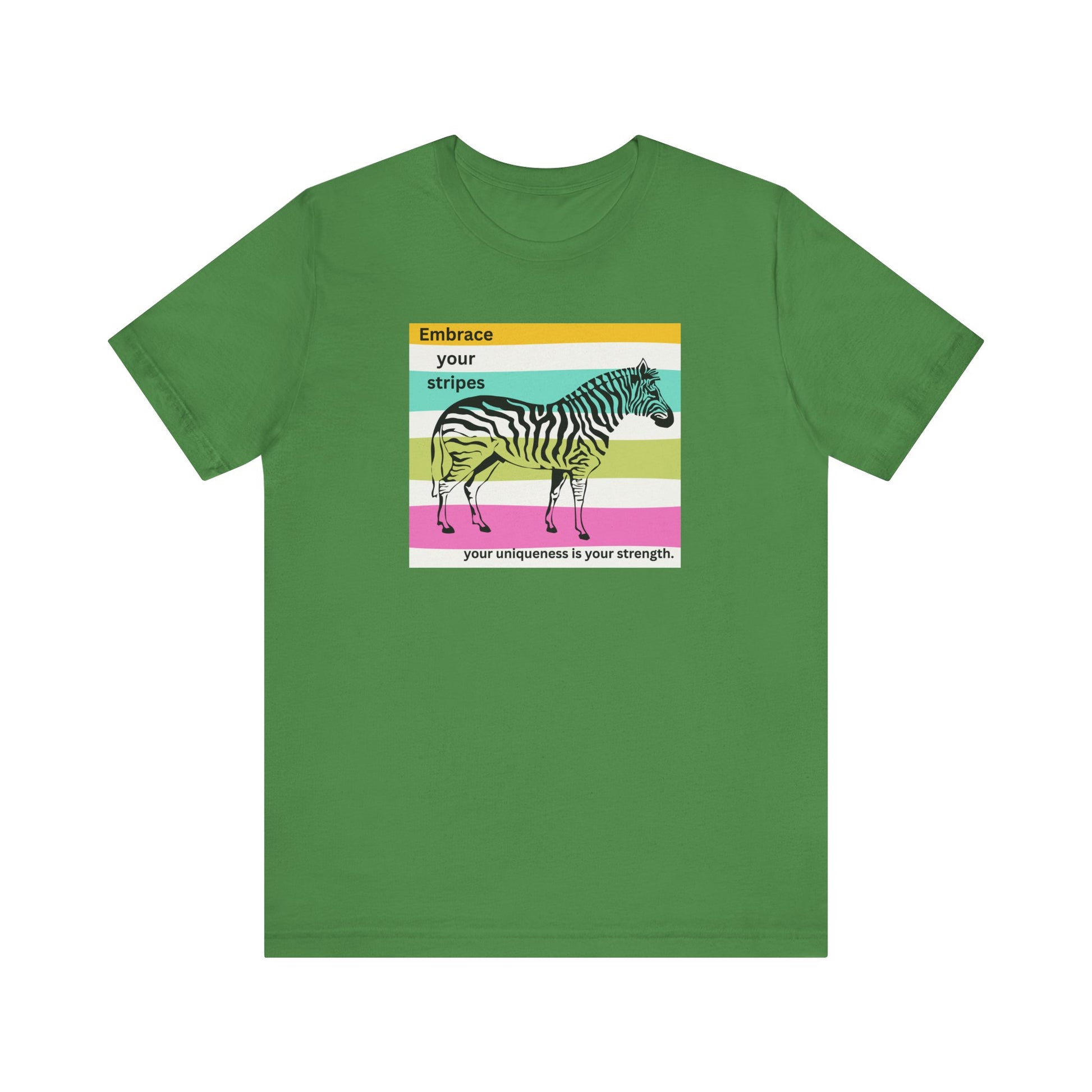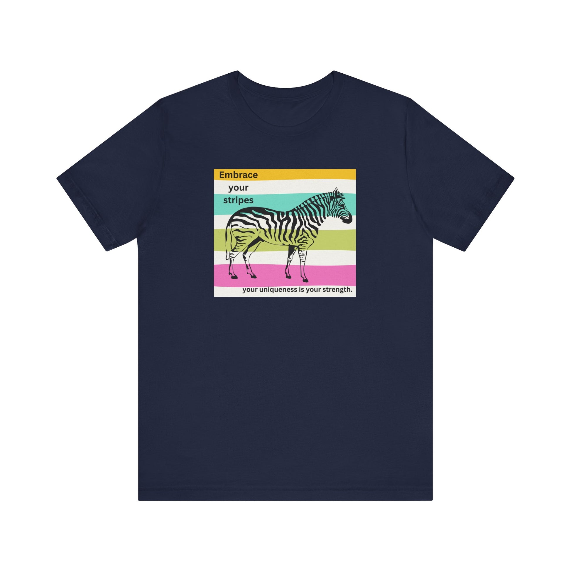 Introducing our vibrant Unisex Jersey Short Sleeve Tee, designed to inspire and uplift. With its fun zebra print and colorful stripes, this tee is not only a fashion statement but a reminder to embrace individuality.