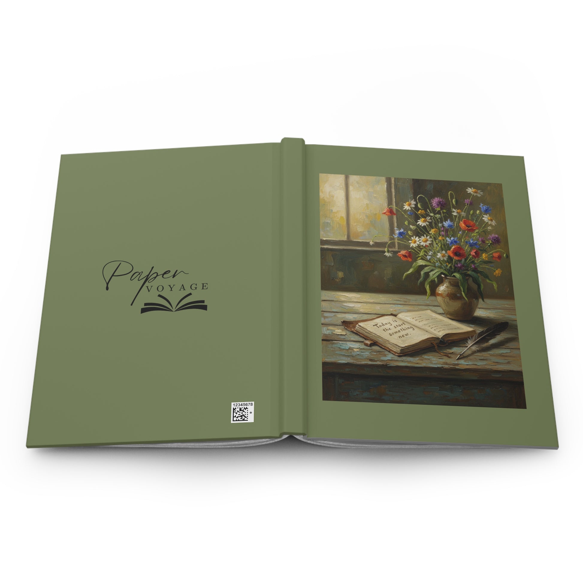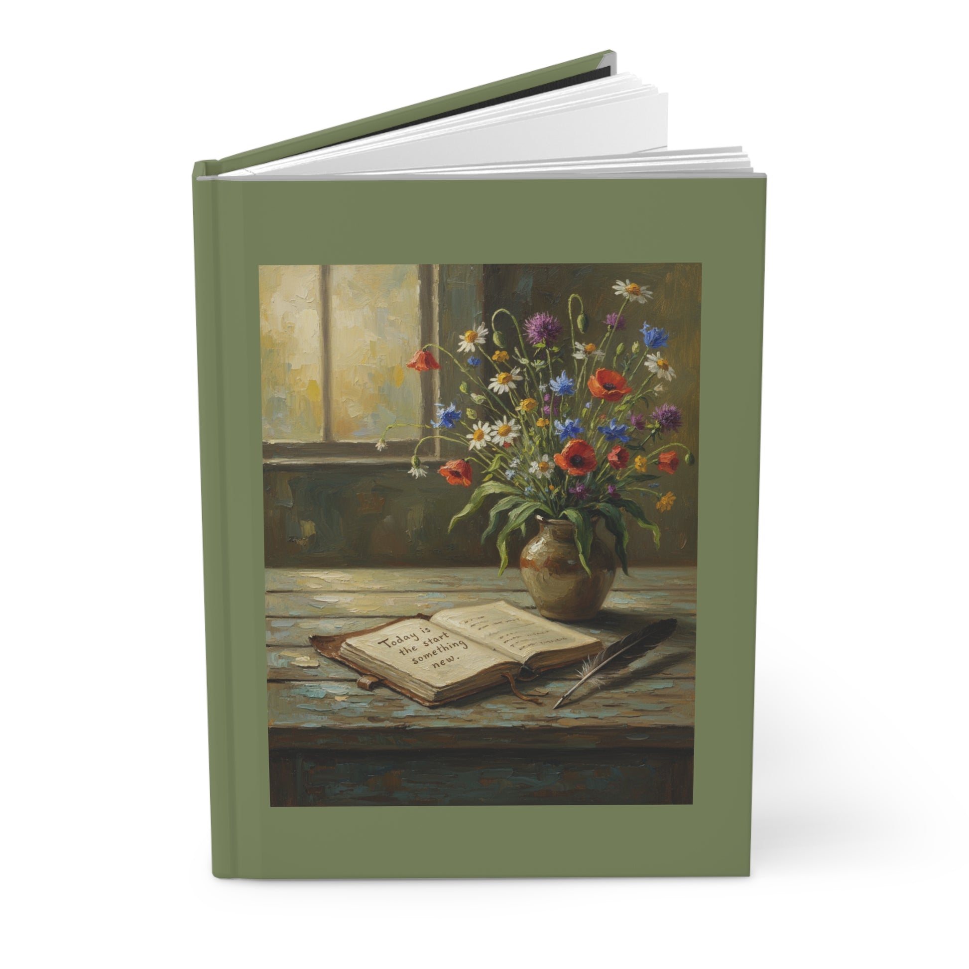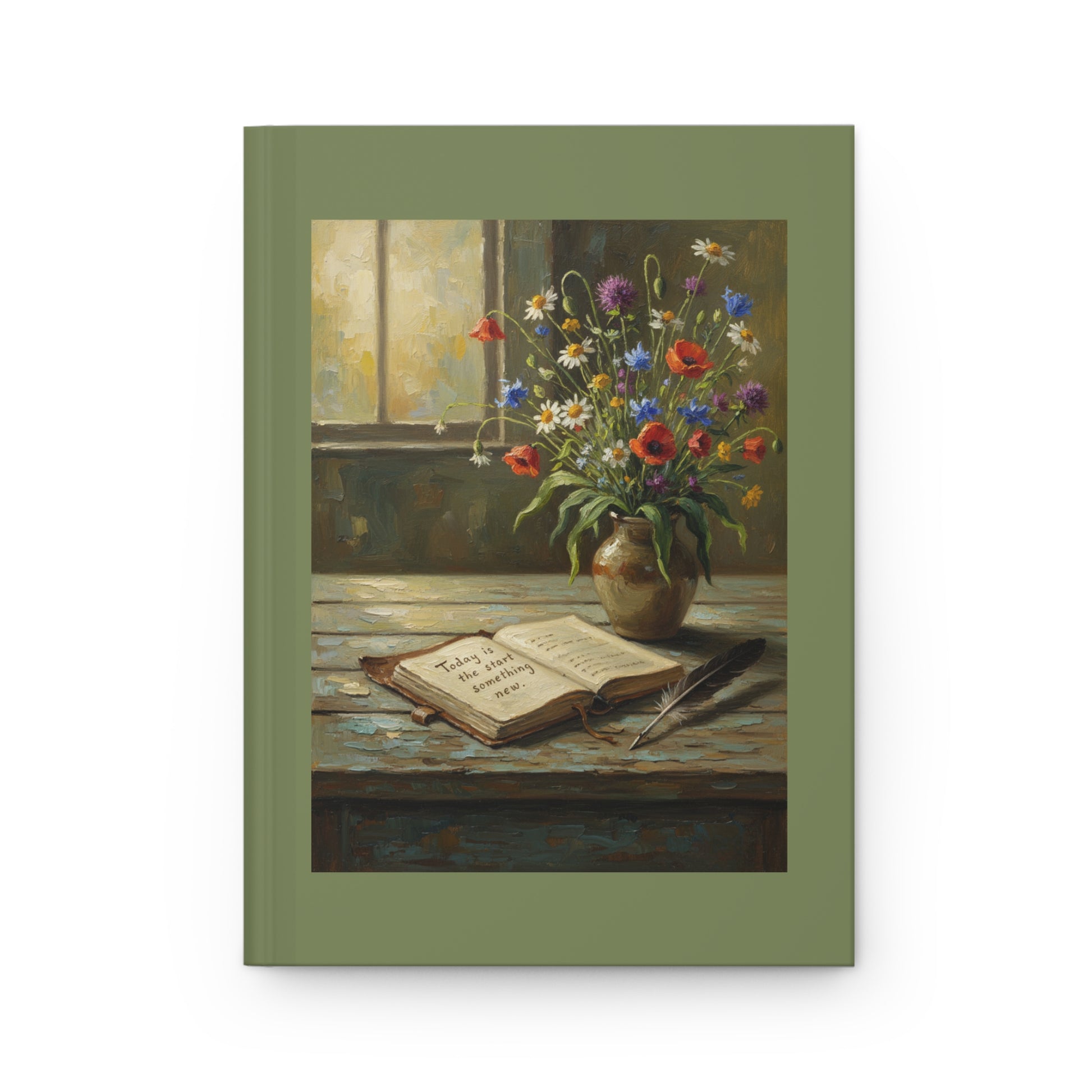 This hardcover journal brings a quiet, painterly moment to your desk. The front shows a sunlit still life—an open journal, a feathered pen, and a vase of wildflowers—set against a muted olive-green wraparound cover. It feels like a pause between tasks: a place to gather thoughts, sketch a memory, or practice morning pages. The matte laminated finish keeps the artwork soft to the touch while protecting it from daily wear.